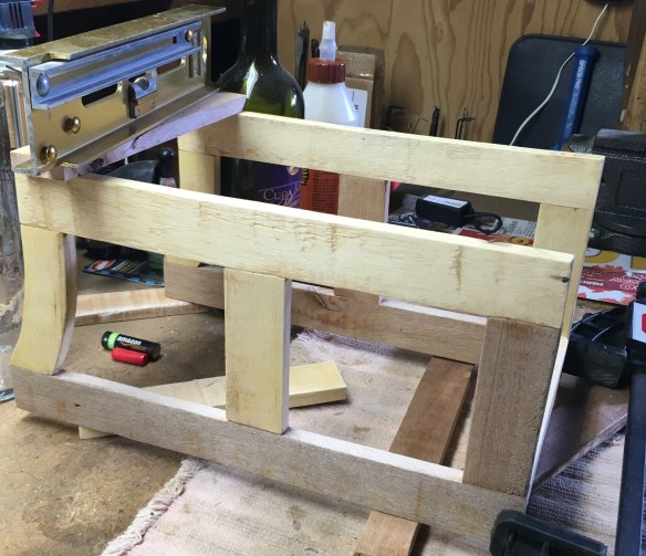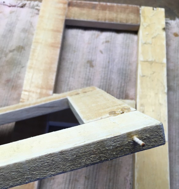 I decided to make the box out of pallet wood. It’s free and it’s recycled – two things I like. Here are the two side pieces. I glued and pinned the wood together using toothpicks. It works really well.