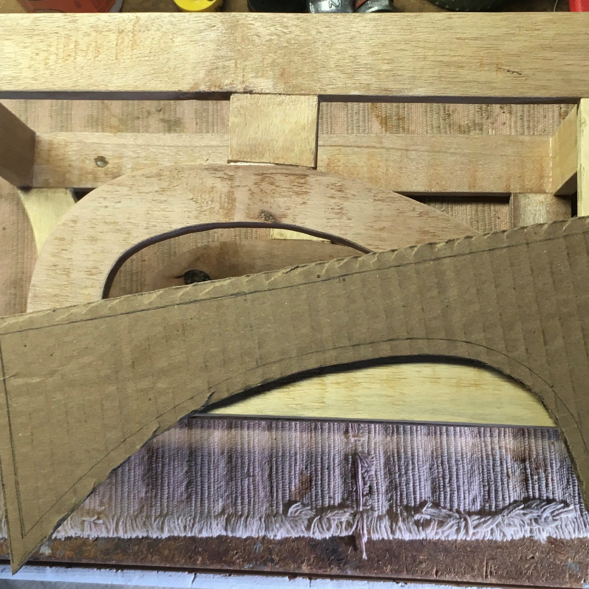 In the original design, I had a center wood post on each box side. After looking at the box, I decided that it did not resemble the back end of the Morris Minor Woody. Back to the drawing board. I made a cardboard arch to resemble the arch above the car tire. I really liked this concept and went with it.