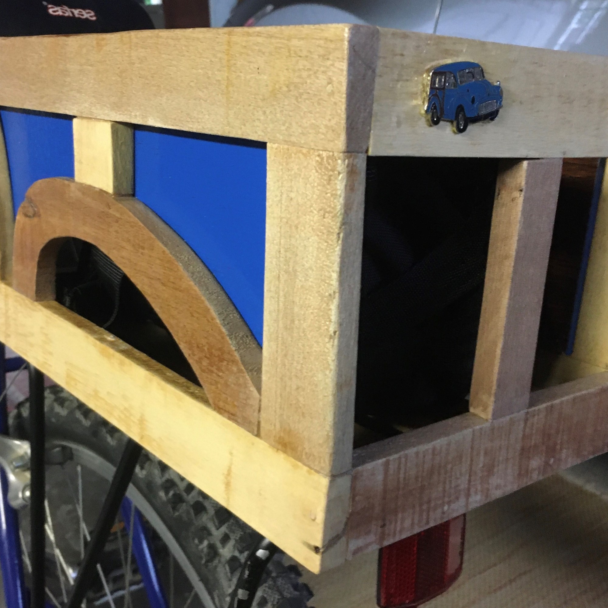 Here is the final version. I decided to paint one side of the panels blue to match the bike. I added tabs to make the sides reversible – wood or blue. Additionally, I bought a blue Morris Minor Woody metal pin and added it to the back of the box.