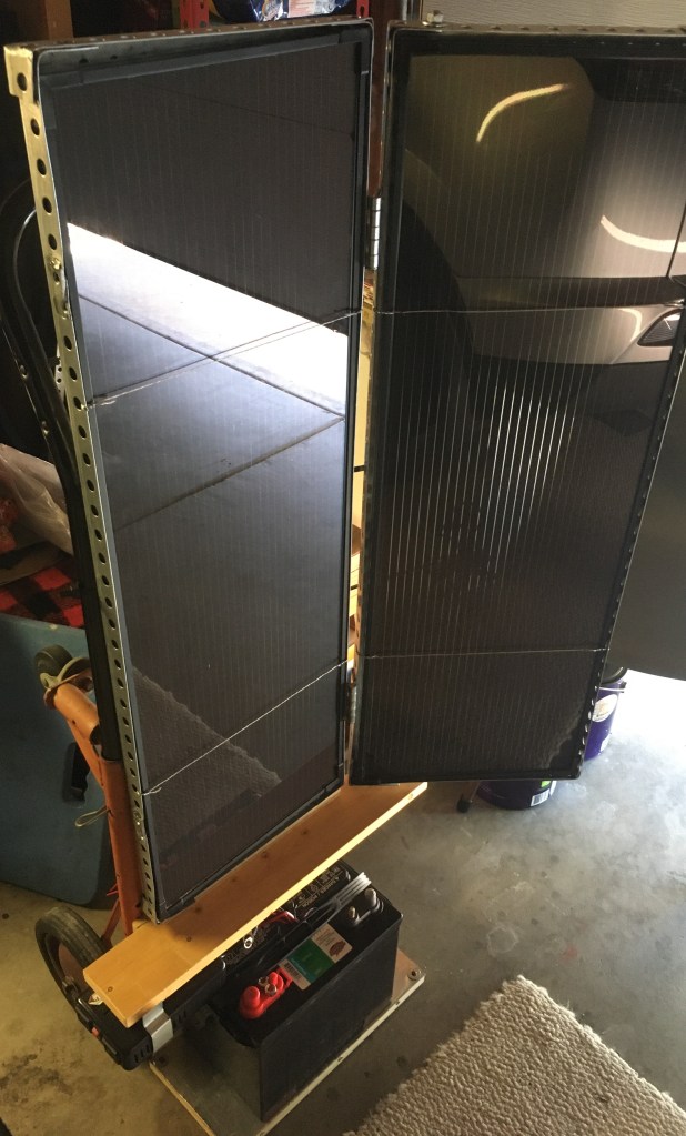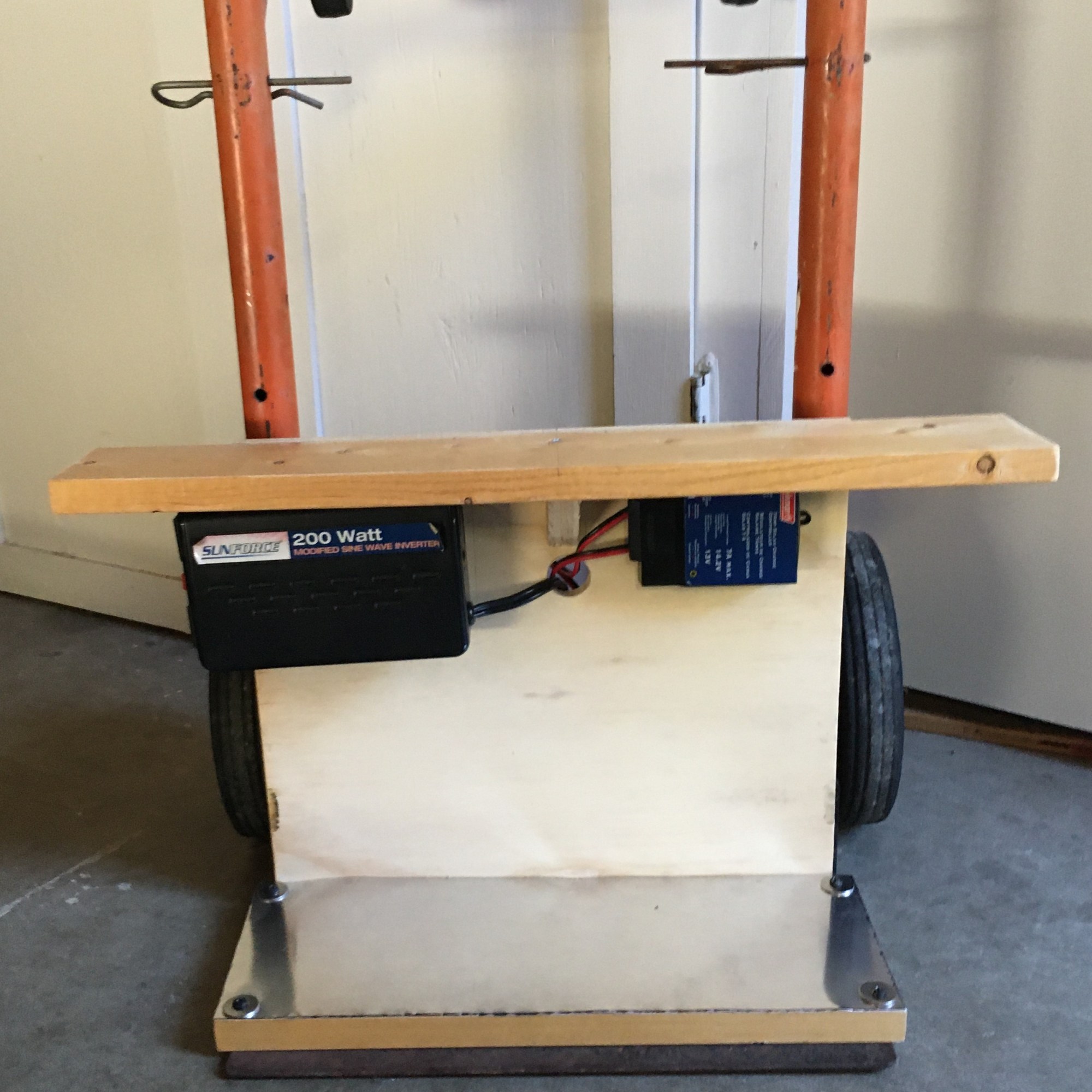 Next day I bought a deep-cycle marine battery. When I got it home, I realized that it was not sealed. Meaning, that if you tilt the kart back, which I have to do to maximize the sun’s exposure, the acid will leak out. Geez, who designed this project anyway?
