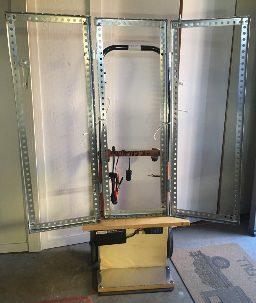 Here are the 3 panel frames bolted together and hinged. The concept worked. It was a little flimsy, but seemed okay. This is where things started to go wrong.