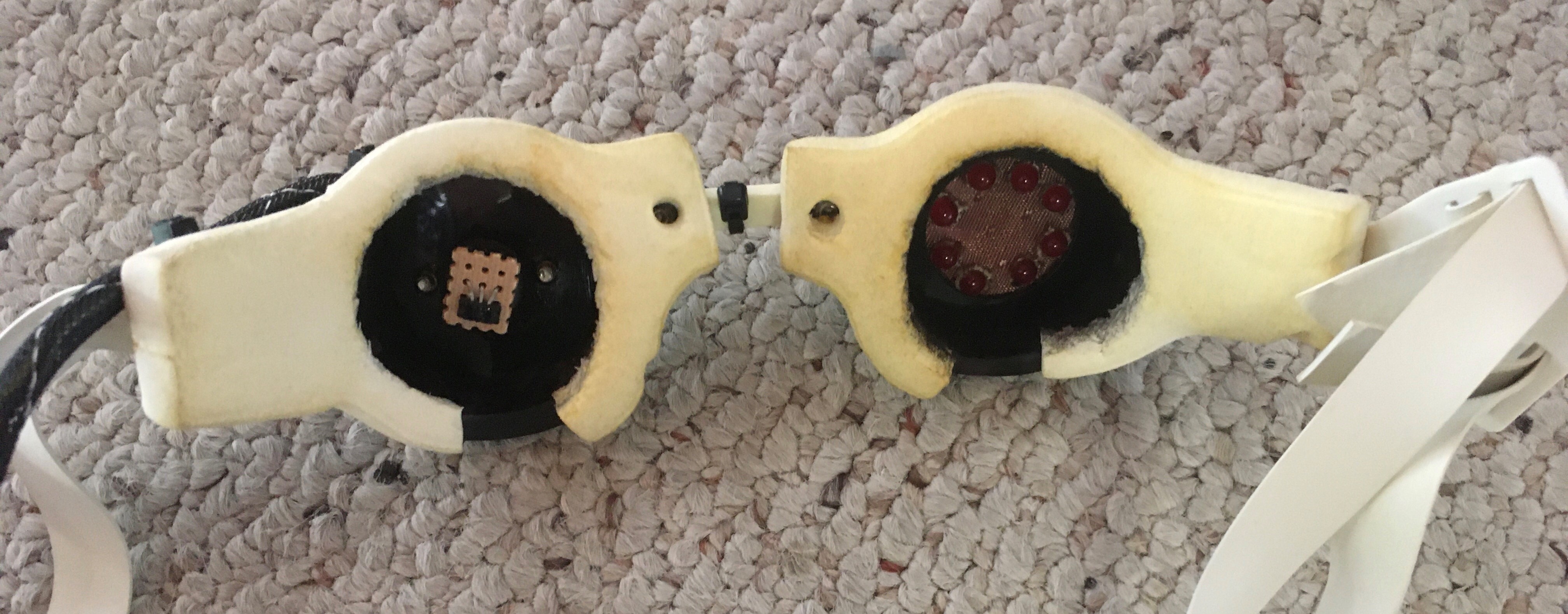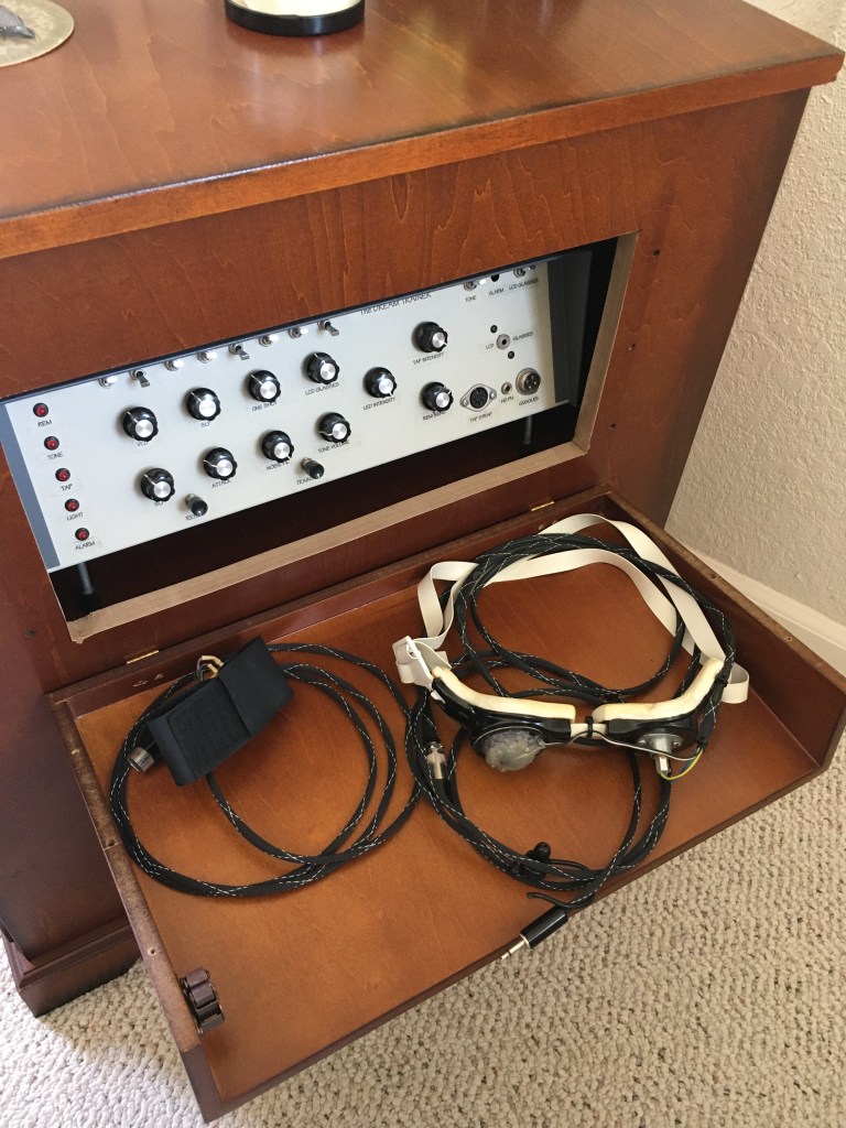 When I saw the picture of the dream goggles in National Geographic, I had to have a pair! Of course you could not purchase these, so I designed my own lucid dream-training center complete with flashing LED goggles and more. The final result is pictured below. I call it The Dream Trainer.