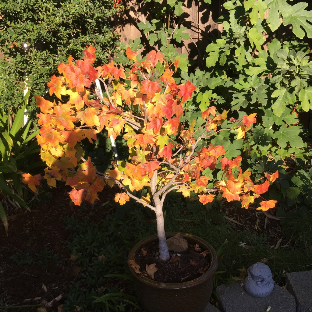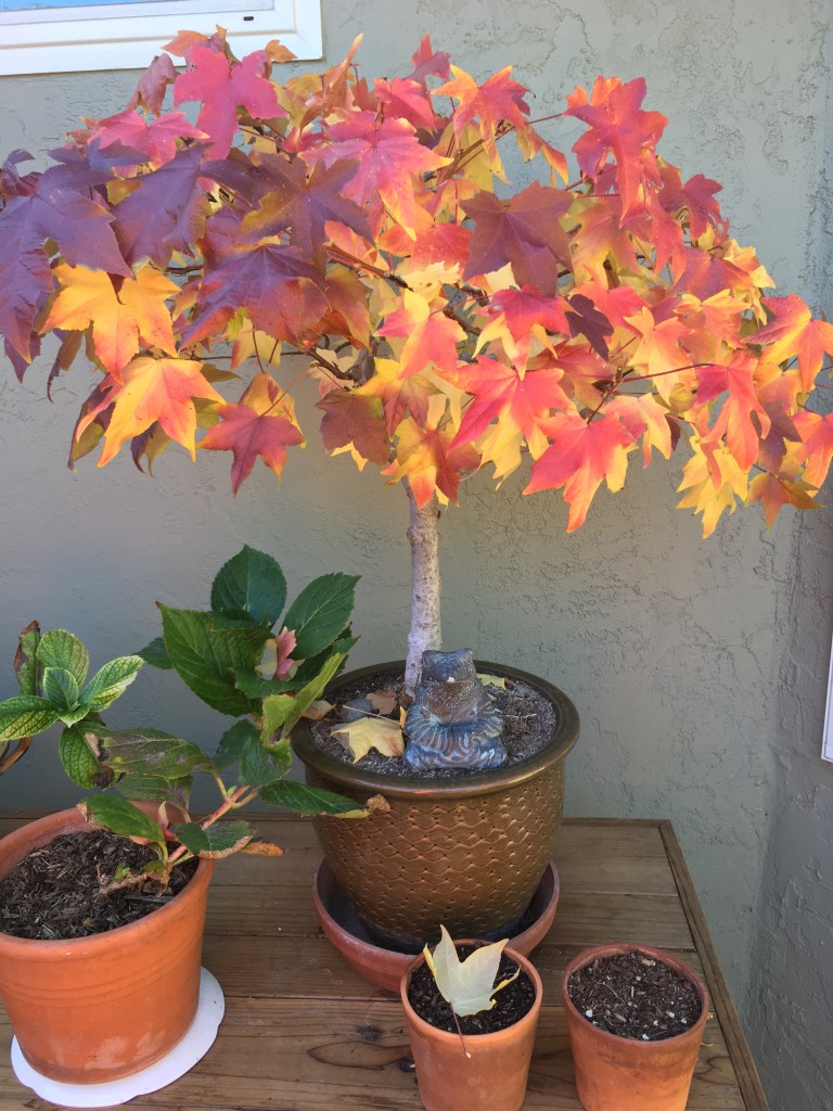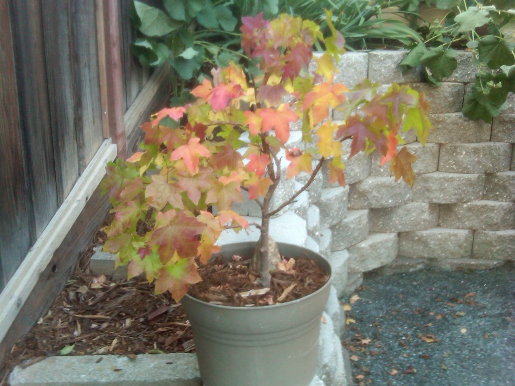 I once had a massive liquid amber tree in the front yard. One year, one of its seeds found its way into a pot with only dirt in it. This is what it looked like in Fall 2011. I did absolutely nothing – it was all voluntary.