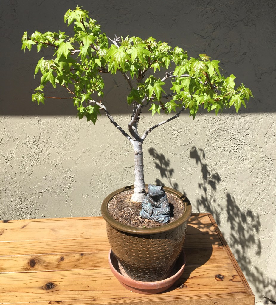 Keep in mind that a liquid amber tree will grow like mad. If you want to keep it like a bonsai tree, trimming and re-potting will be required.