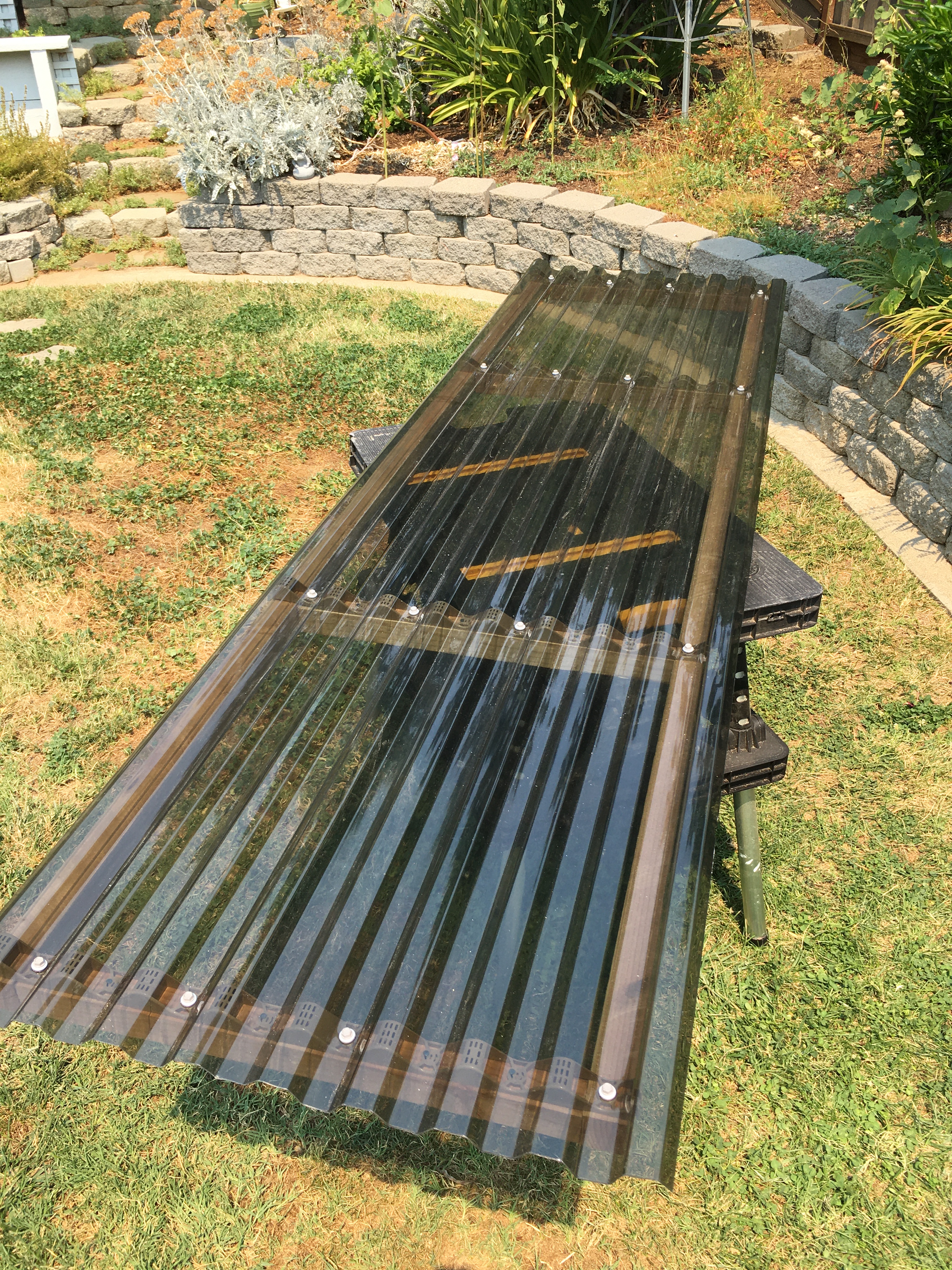 Why not use a piece of tinted 2′ x 8′ corrugated plastic, with a frame and hinges so that it could be opened and closed. Seemed so much simpler to me.