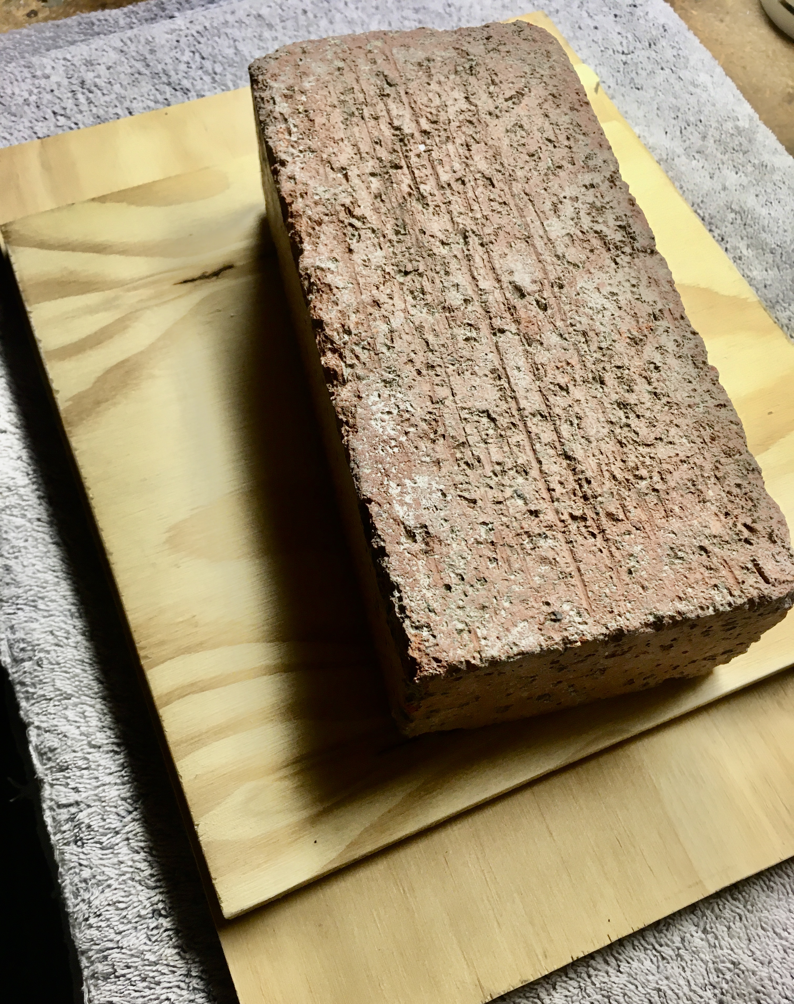 The redwood tree leaves that I had gathered needed a little flattening prior to securing to the mat board. I placed them on a piece of plywood, put a second piece on top, and then added a brick for weight. I let that sit overnight.
