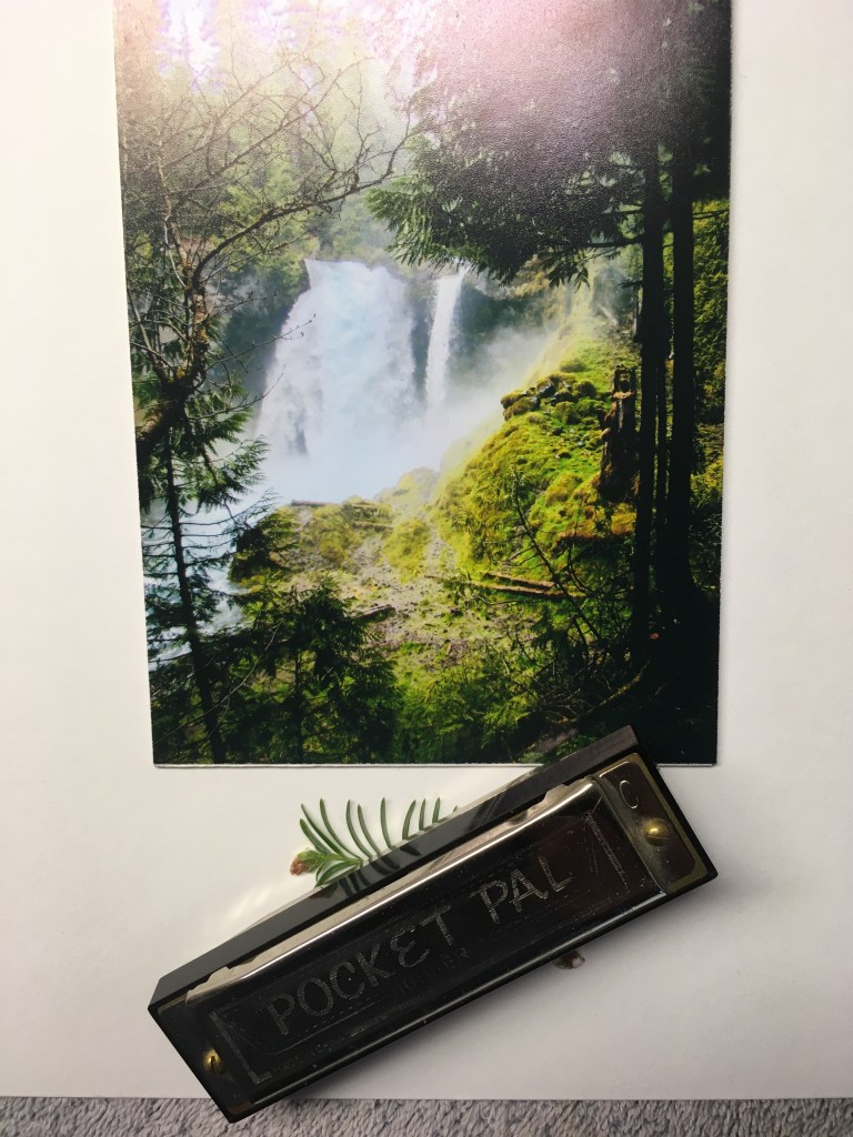 I positioned the leaf on the mat board, secured it with white glue, and held in place with my harmonica. Hey, it was nearby.