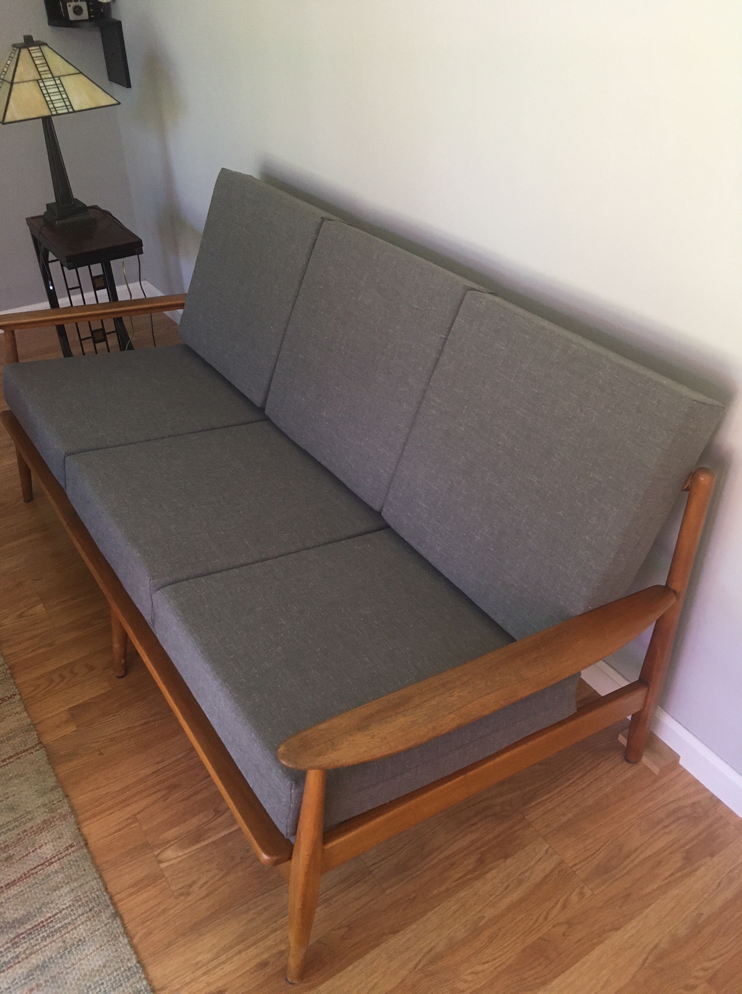 A special friend of mine was given some mid century modern living room furniture – a couch and two chairs. They were in very good shape and only needed some minor wood repairs, which I completed. As you can see, one can never have too many clamps!
