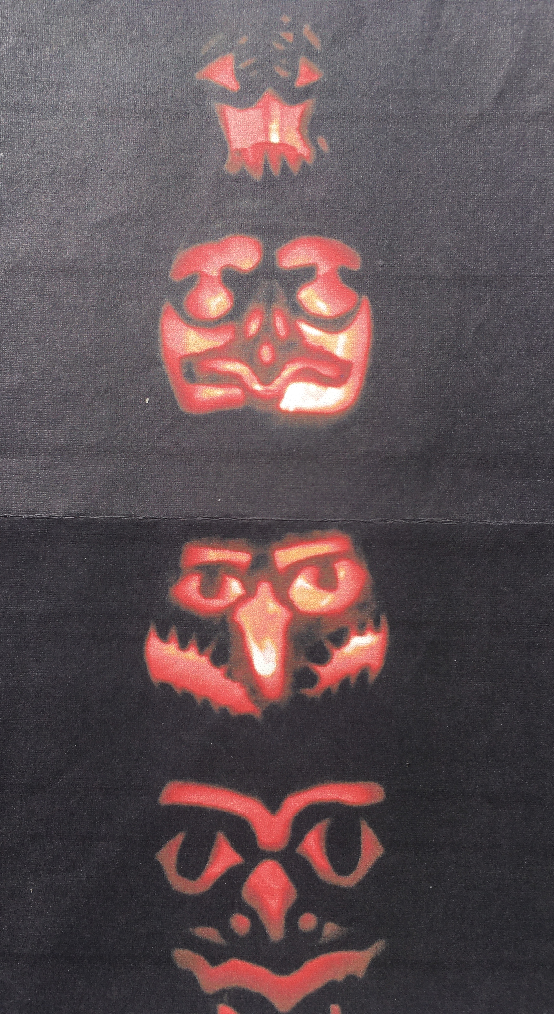 Probably my most ambitious pumpkin project was this Totem Pole. It began as only four real pumpkins (illuminated on the right side). They looked so good, I bought a bunch of Funkins (foam pumpkins) and made a larger totem pole and stand. I know, who would do it?