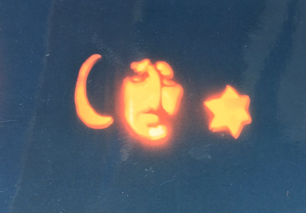 Do you see the image of musician Frank Zappa below? This was a very unusual pumpkin. When it was not illuminated, it looked like, well nothing but holes. When lit up… his eerie image appeared.