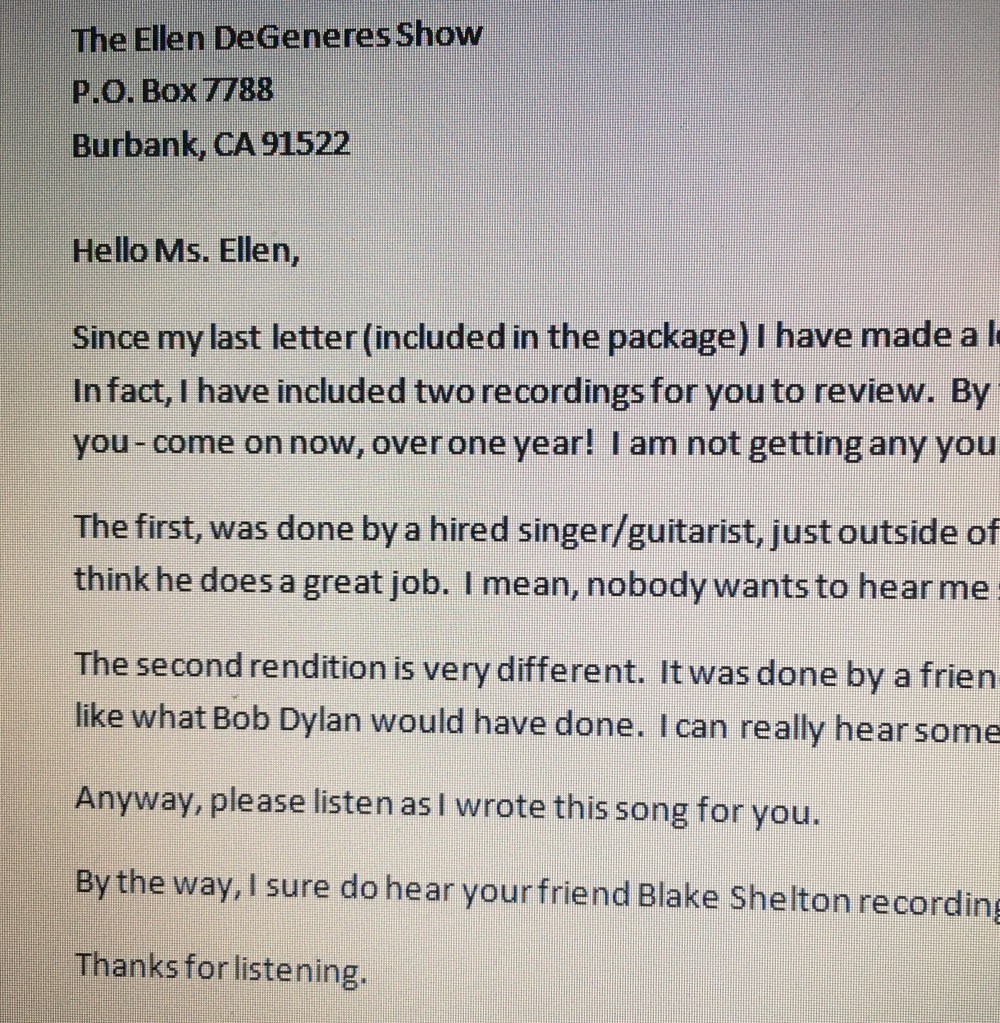 Her show inspired me to write a song titled “Just Be Kind.” I decided that I would write letters to Ellen letting her know about the song and its progress. I wrote her two letters in all. I’d hoped that just maybe, the letters would be read and I could get tickets to her show, and give Ellen the song.