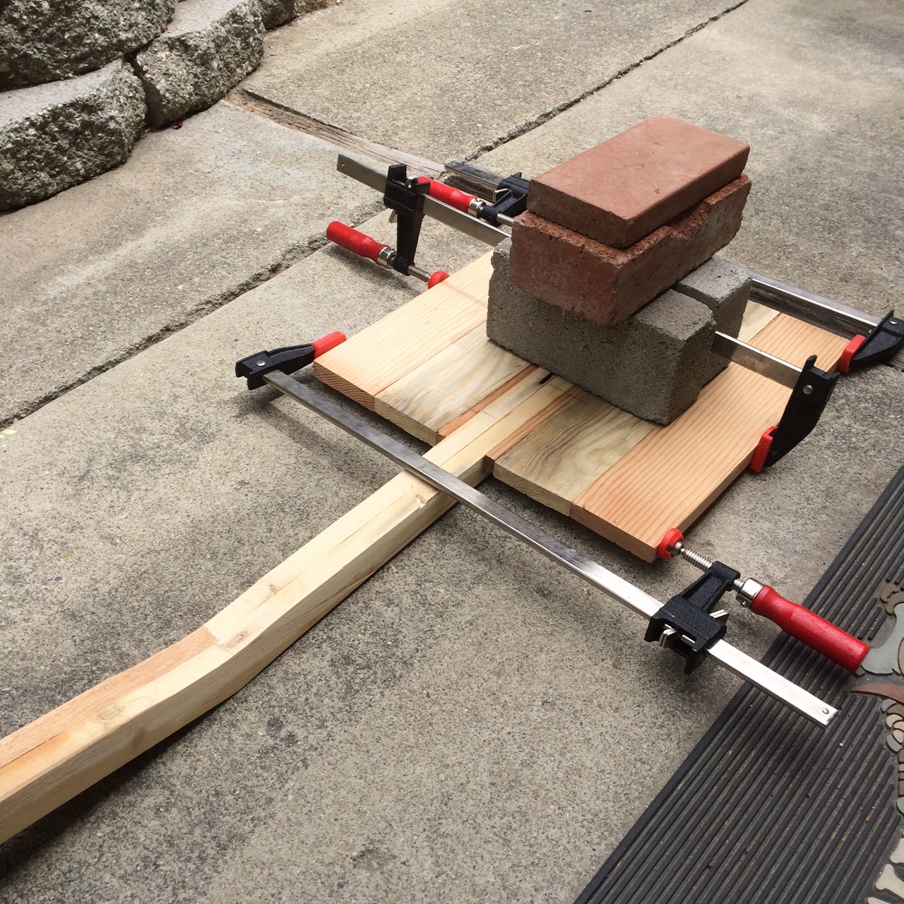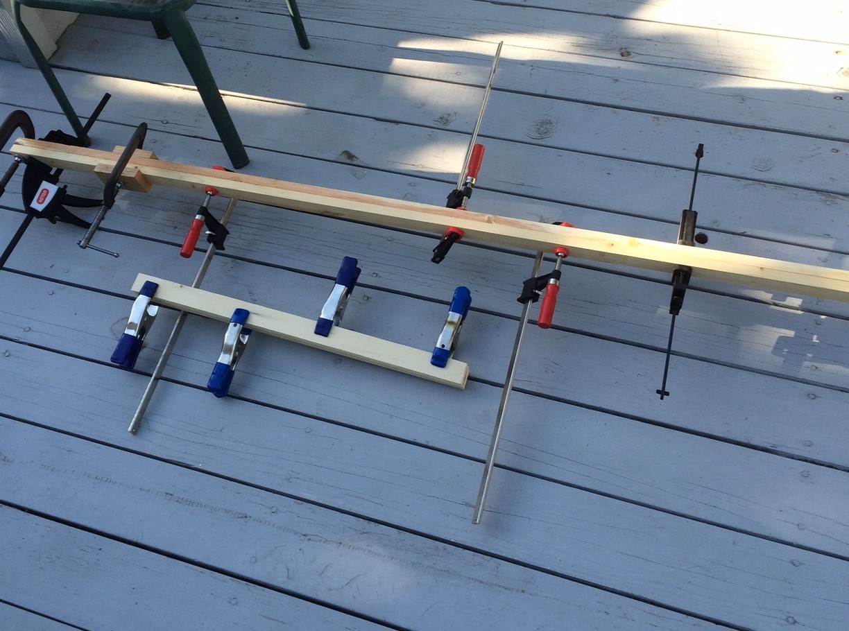 In the second picture (on the right), I have glued up the shaft, shaft angle, and the paddle. I put weight on the paddle so that it would not bow under the pressure of the clamps.