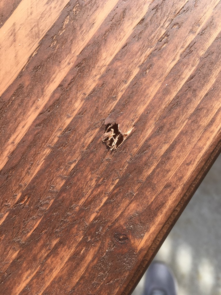 I used a small steel guide to keep my drill bit straight. The first hole went okay. However, the second hole drifted and I wound up blowing out the side of the shelf. Result: The shelf was ruined. All the cutting, sanding, and staining was time and money wasted. Yep, I was just a little bit frustrated! If you plan to do shelves like this, find a friend with a drill press.