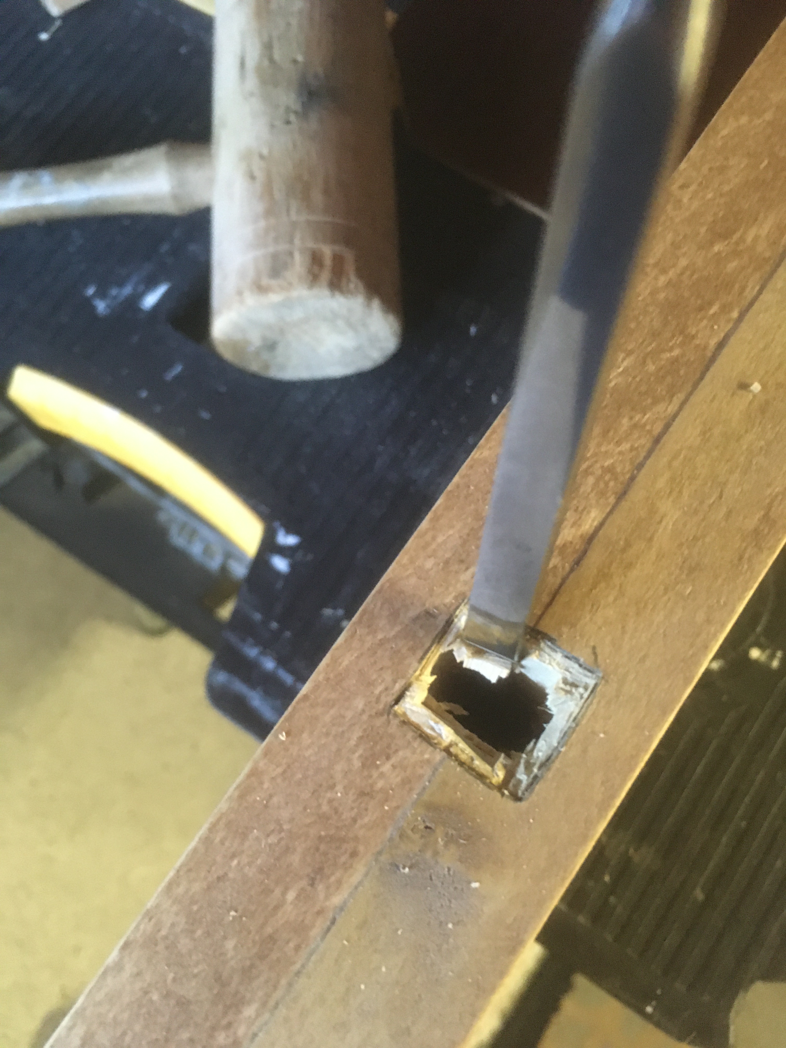 I laid the boards on top of the bracket posts and marked off their locations. I then made cut marks and slowly gouged out the slots. It took a lot of time, and fit testing, but it worked! Of course, a router would be the way to do this job quickly.