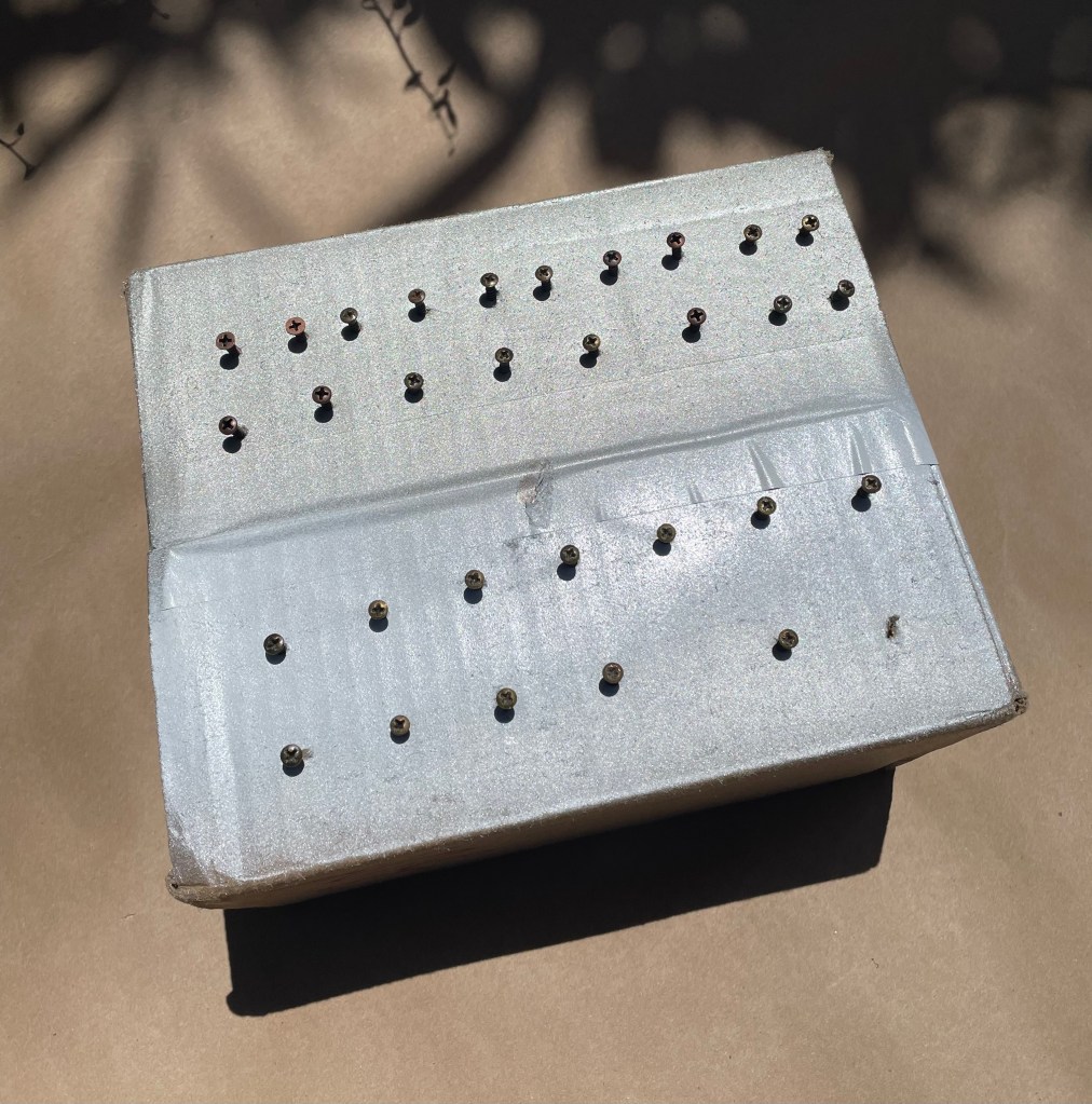 While searching the web on how to clean hinges, I found a simple and great idea. Obtain a cardboard box and drill small holes in the top. Place the cleaned hinge screws in each hole. Insert about halfway down.