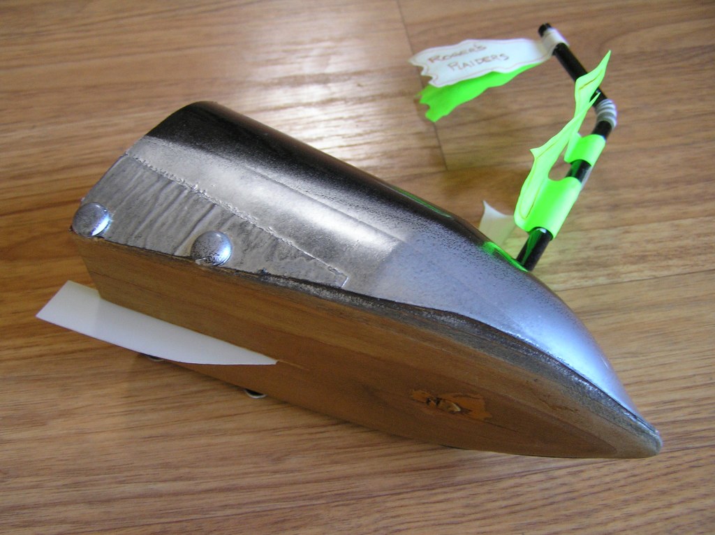 First, I cut and shaped the plywood piece, as in the diagram below. I also rounded off the bow (front of the boat) and sanded the entire bottom. Later, I applied some wax to make it ‘extra’ smooth, for less resistance in the water.