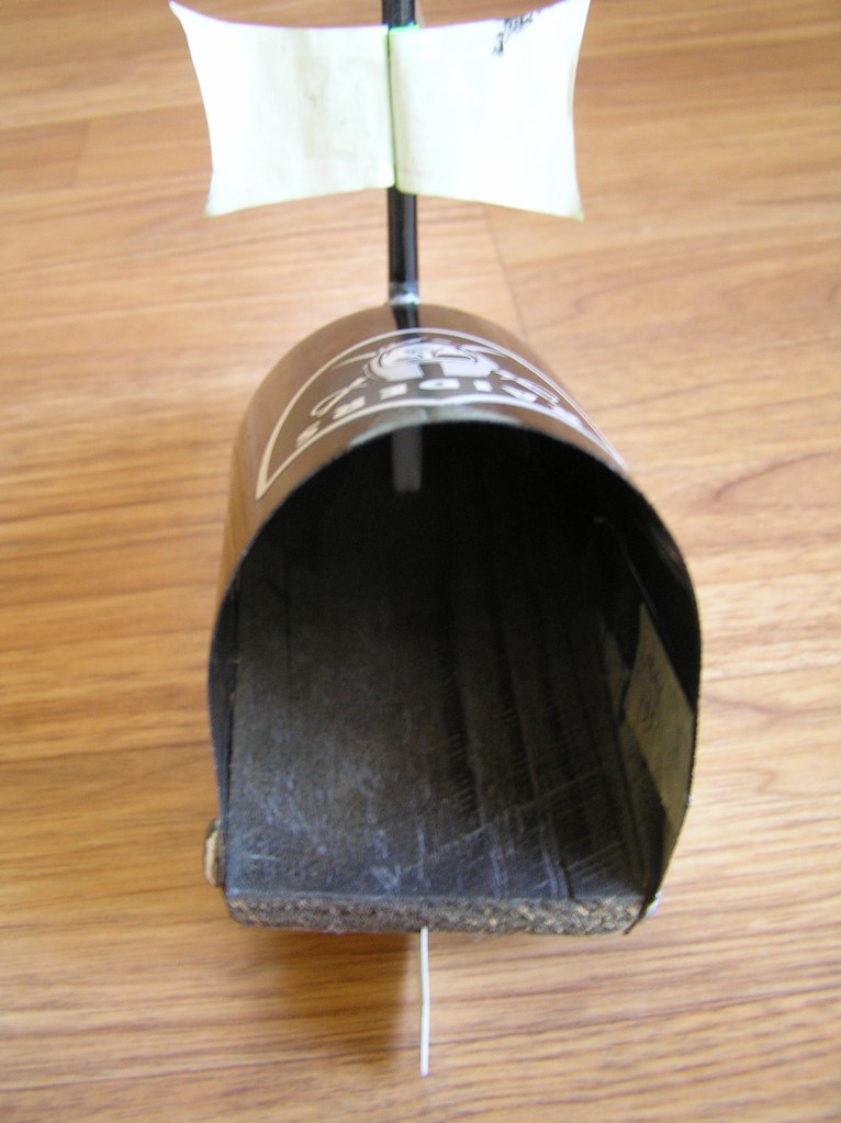 Next, I cut off the end of the plastic bottle, and inserted the cut and shaped plywood into the bottle, as shown in View A, of the Gutter Boat diagram above. Angle the plywood so that you obtain a good rear canopy (opening) to blow into.
