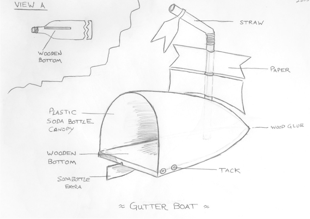 A gutter boat made from a plastic liter soda bottle. You simply place the boat in the water, and blow into the rear of the plastic canopy. The sails were only decorative, as we had to use the paper and straw elements in our design.