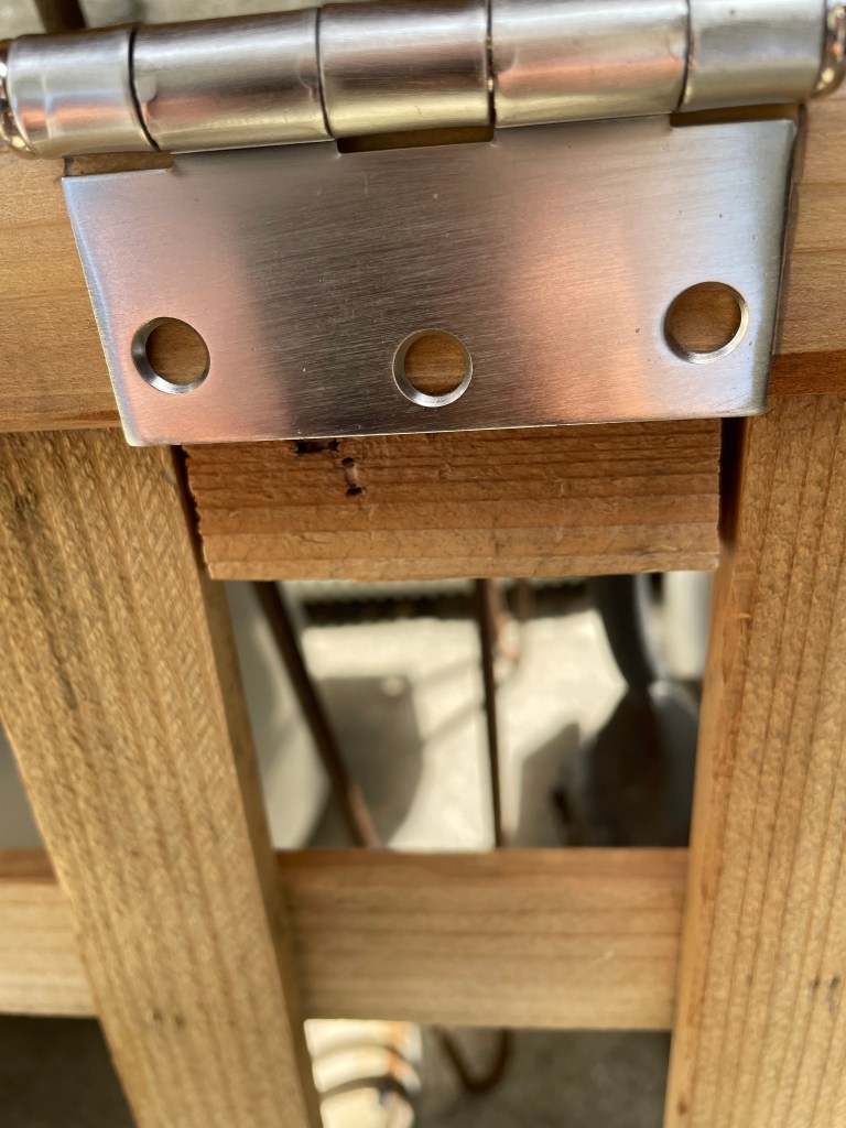 I positioned the hinges, and glued a small wood spacer directly behind the open space in the lattice. This provided more wood for the hinge screws to bite into.