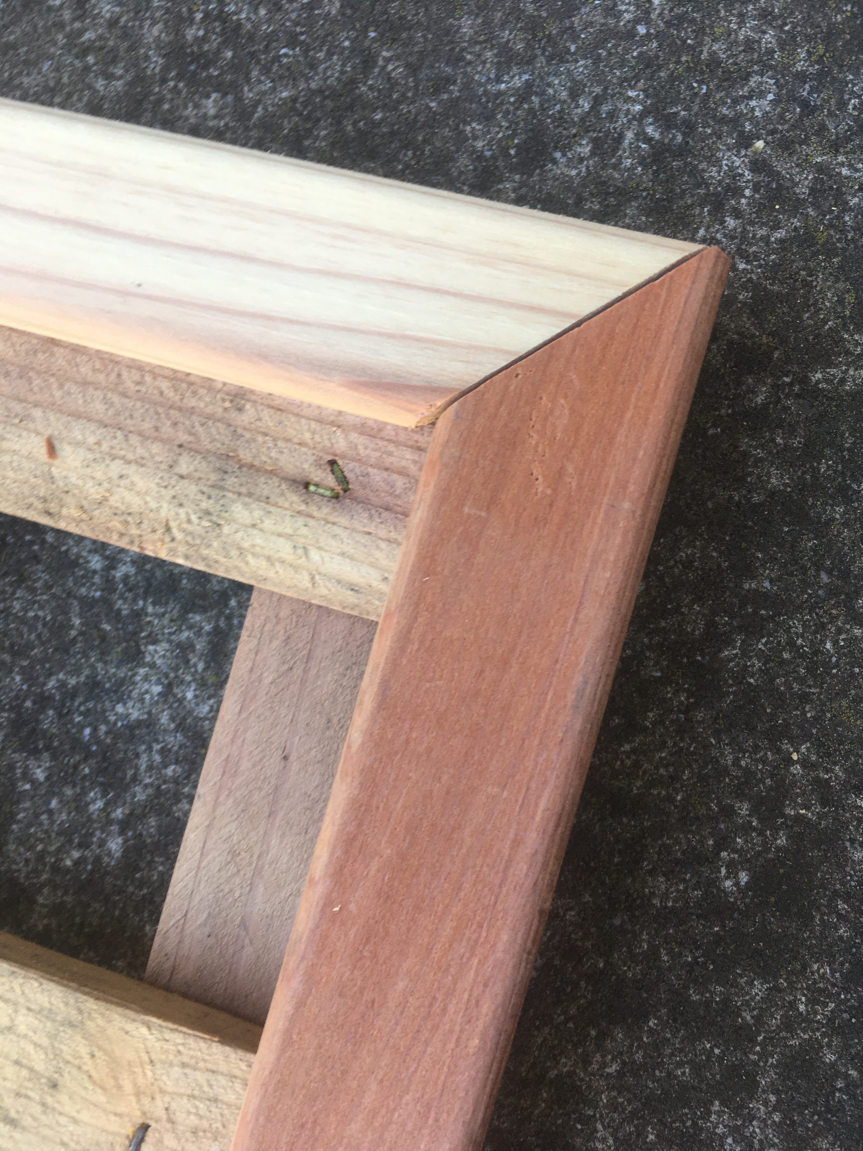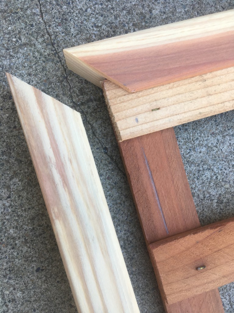 Make sure that you carefully layout the redwood channel pieces prior to cutting the 45 degree angles. I suggest cutting one 45 degree at a time and then lining it up with the lattice as shown below.