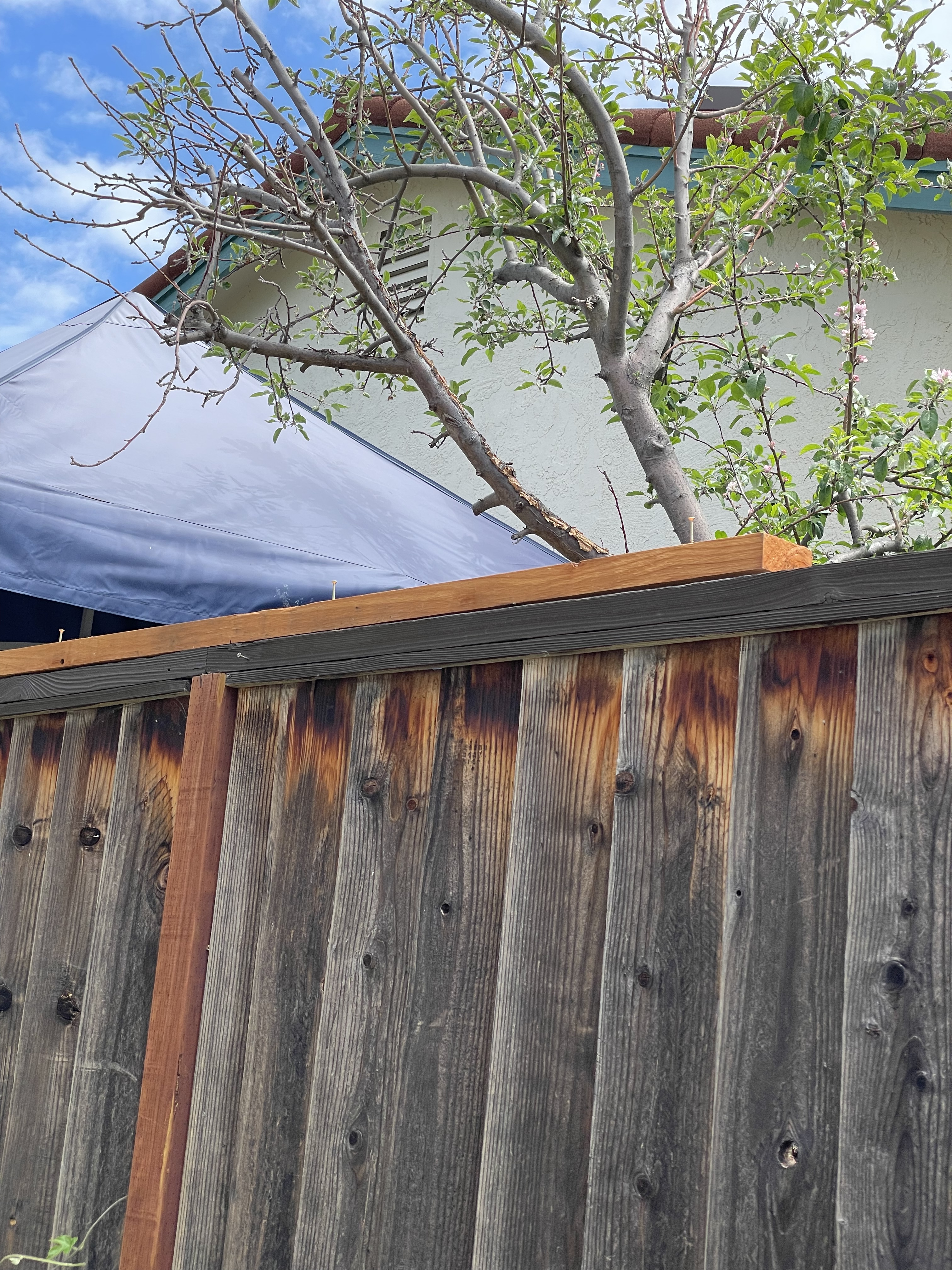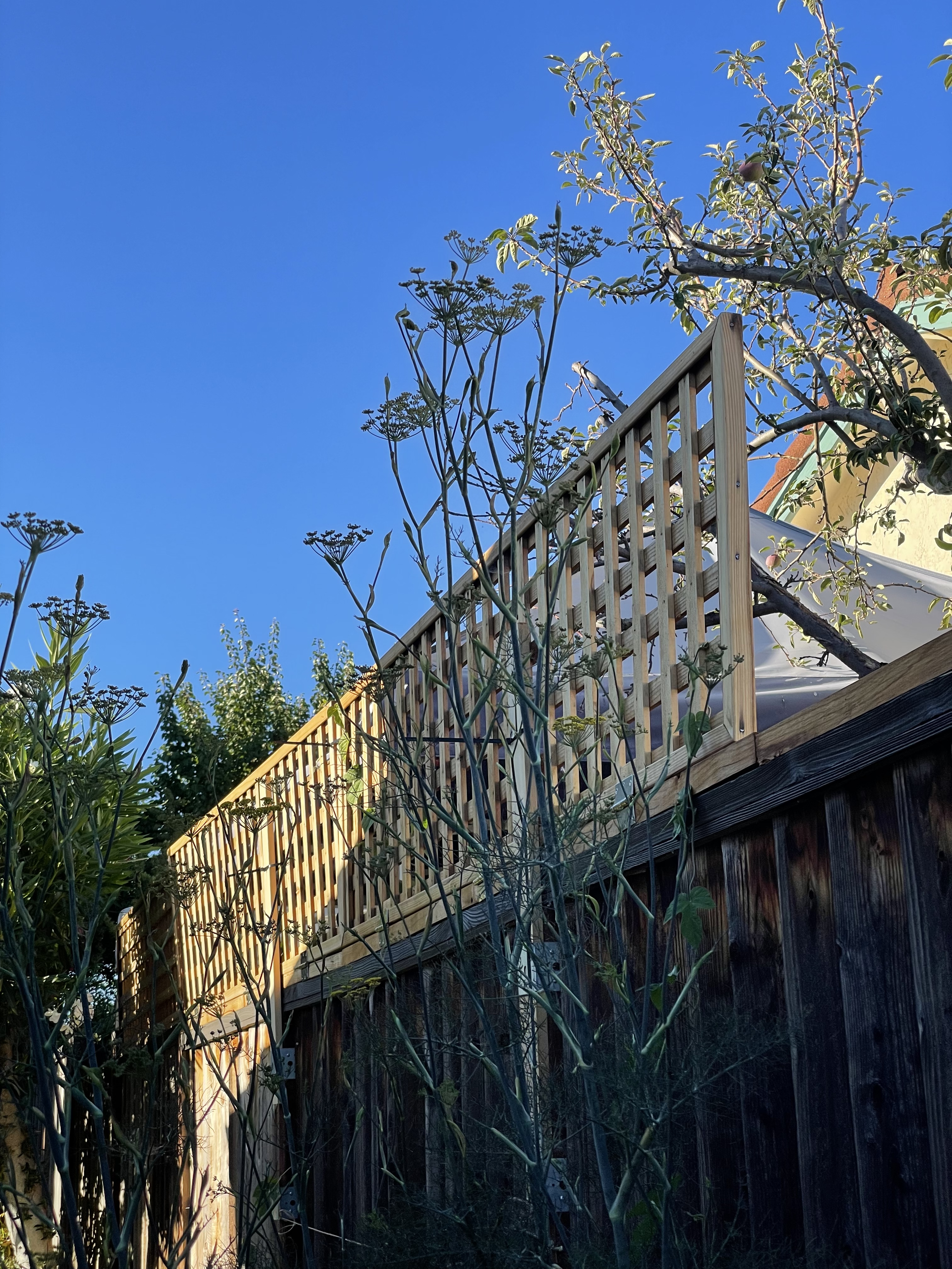 I used square lattice and redwood channel to build the toppers. I made 3 toppers, each 7′ long and 2′ high.