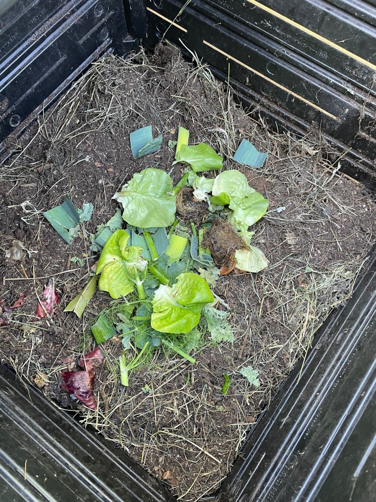 It’s a simple process really. You open the lid and place vegetable scraps into the bin. You can also add yard waste like leaves, grass cuttings, and plant cuttings. I try not to add too many ‘woody’ stalks, as they have a much longer breakdown cycle.