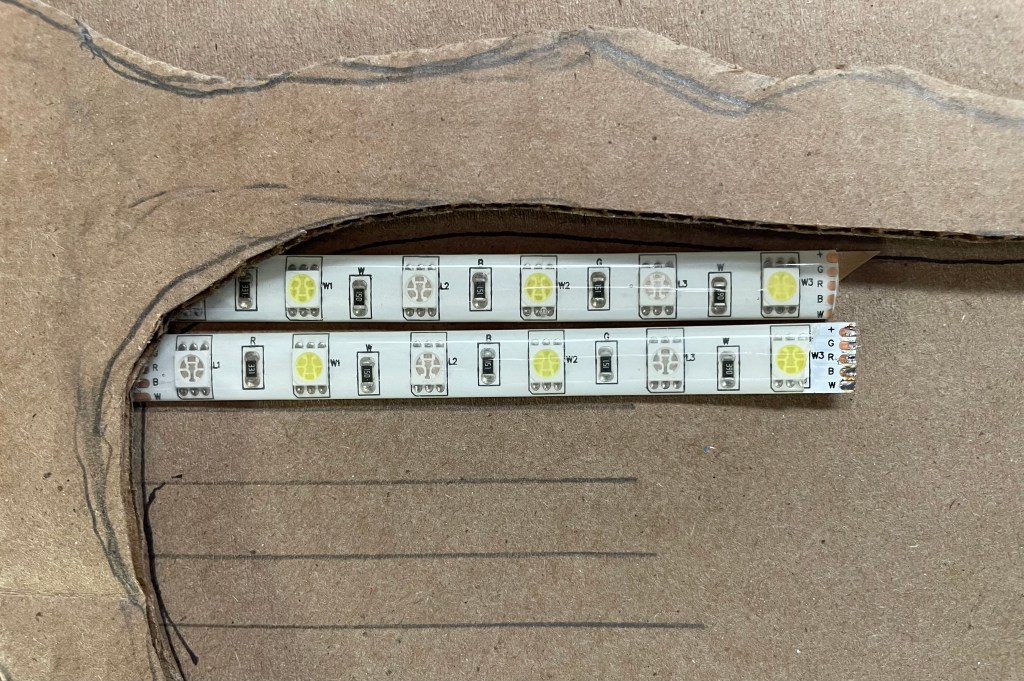 I decided that I would cut the strips and connect them together, so that they could be laid out flat. The LED resolution would not be as good, but at least I could keep the project moving.