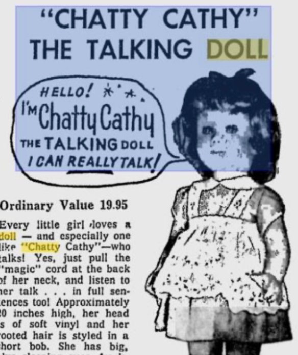 Talky Tina actually gave me an idea for a song. No, she did not speak to me, but the episode did. I recalled the “Chatty Cathy” doll of my generation, and how I used to hear her phrases over and over again. Even as a kid, I remember the neighbor girl endlessly pulling Chatty’s ring to initiate her voice recordings. Geeze, really!